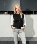 Von 'teeuno' kommt diese tolle Damenjacke im College-Stil und präsentiert sich als frische und modische Option. Mit kontrastierenden Bündchen verleiht dieses Design einen adretten Touch, der nicht unbemerkt bleibt. Der gebürstete Sweatshirtstoff auf der Innenseite sorgt für einen angenehmen Tragekomfort, während charakteristische Details wie die gestreiften Rippbündchen an Kragen, Saum und Ärmeln sowie Metalldruckknöpfe den coolen Look unterstreichen.