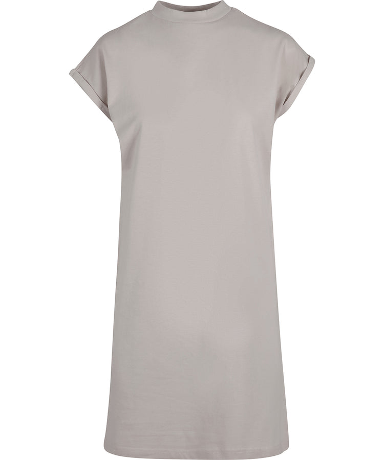 Der hohe Schnitt verleiht einen Hauch jugendlichen Charmes und macht das Kleid perfekt für viele Anlässe, vom legeren Ausflug bis hin zu gehobenen Events. Das kragenlose Design mit Rundhalsausschnitt sorgt für einen klaren, modernen Look, während die kurzen Ärmel ein dezentes und dennoch elegantes Detail darstellen, das den minimalistischen Look unterstreicht.