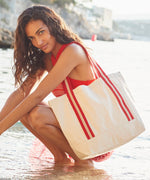 Die Schönheit dieser Tasche geht über ihre organische Beschaffenheit hinaus. Ihr Design ist praktisch und elegant, mit kontrastierenden, gestreiften Stoffgriffen, die einen Hauch von Farbe und Persönlichkeit verleihen. Diese Griffe, erhältlich in vier verschiedenen Farben, bestehen aus weichem Baumwollstoff und garantieren maximalen Komfort, egal ob Sie die Tasche in der Hand oder dank ihrer Länge von 56 cm über der Schulter tragen.