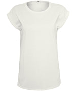 • La camiseta de hombro caído para mujer de Build Your Brand ofrece un cuello redondo, puños de costilla pequeños, hombros caídos y mangas vueltas.