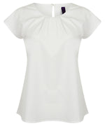 Blusa de mujer con pliegues en el frente y mangas cortas. Con apertura de botón único en el cuello trasero y dobladillos rectos. La tela contiene propiedades de fácil cuidado, absorción de humedad, protección UV y secado rápido. Combina con la gama HB590.