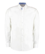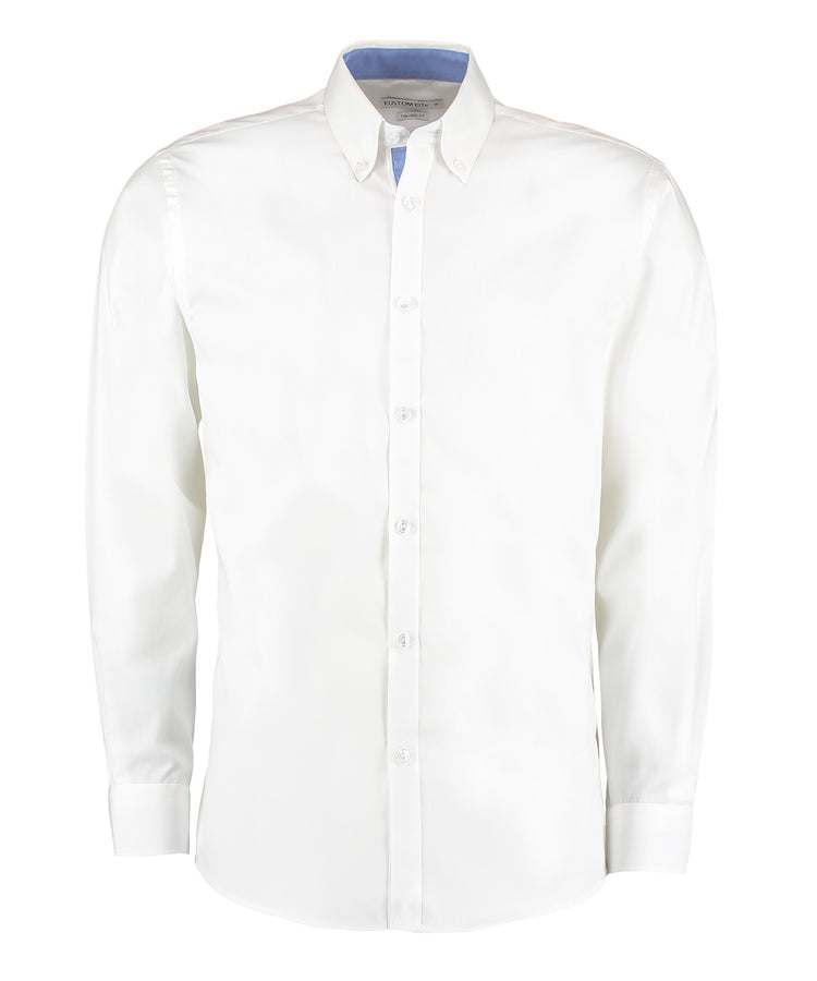 Etiqueta tejida en el cuello trasero de Kustom Kit®. Certificado SEDEX. Certificado Oeko-Tex. Una camisa Oxford premium con un toque de moda que destaca por su contraste en el soporte del cuello, puño interior y tapeta del puño.