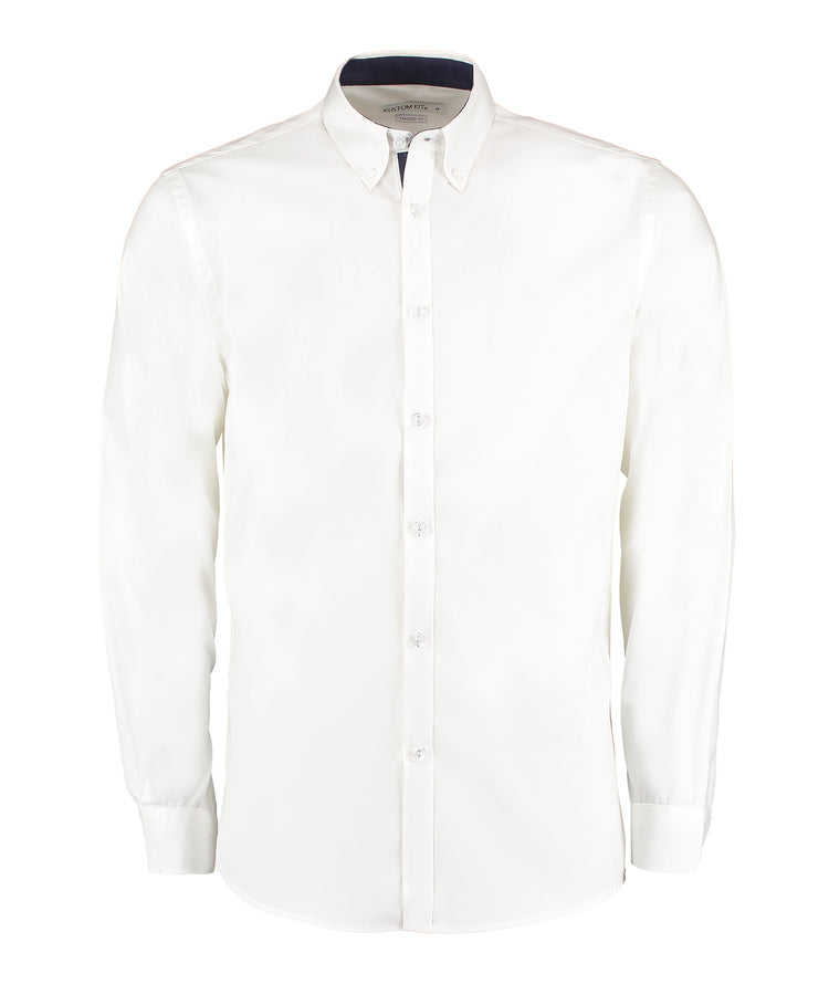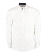 Etiqueta tejida en el cuello trasero de Kustom Kit®. Certificado SEDEX. Certificado Oeko-Tex. Una camisa Oxford premium con un toque de moda que destaca por su contraste en el soporte del cuello, puño interior y tapeta del puño.