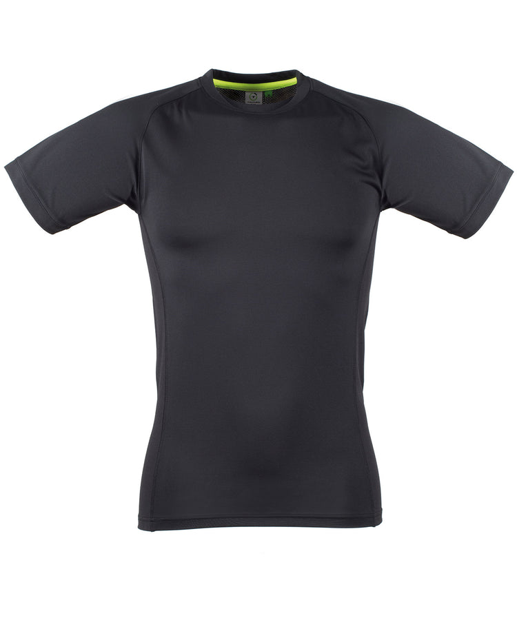 • Camiseta entallada, cuello redondo deportivo de 2 piezas, mangas raglán conformadas, paneles laterales de malla y canesú trasero.