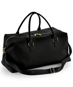 Los pies de base protectores, la cremallera de metal dorado de alto brillo y las asas de transporte de tela propia son características adicionales de acabado. Este bolso de fin de semana boutique presenta una textura de grano fino Saffiano y una etiqueta TearAway para facilitar el rebranding. Certificado por BSCI y Reach, este bolso es una opción sostenible y ética.