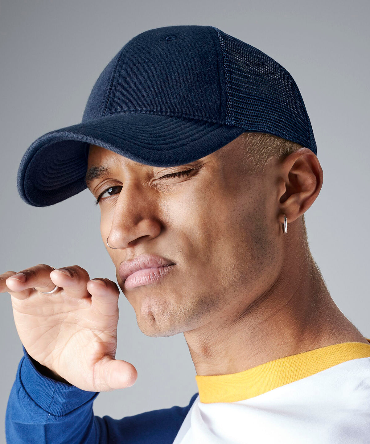 Panel delantero y visera: 100% algodón jersey. Paneles traseros de malla: 100% poliéster.