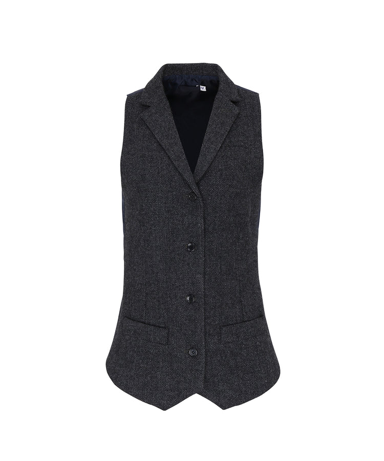 • Con un cuello de solapa que se adentra en el cuerpo principal del chaleco con cierre de cuatro botones.